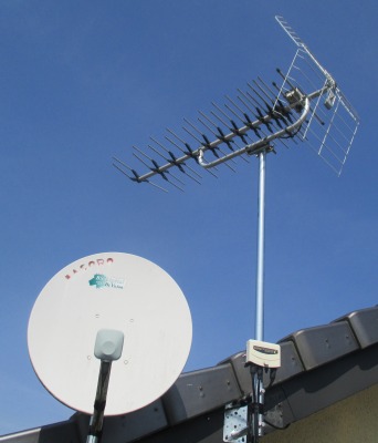 | 地デジアンテナ、BSアンテナとも本体に大きなダメージは無いようでしたので再利用し、取付け金具とポールを交換し付け直しました。 |